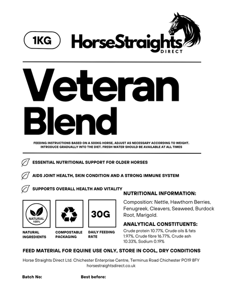 This premium blend includes a selection of high-quality ingredients including Nettle, Hawthorn Berries, Fenugreek, Cleavers, Seaweed, Burdock Root, and Marigold. Each ingredient has been carefully chosen for its beneficial properties, helping to support overall health, vitality, and well-being in senior horses.